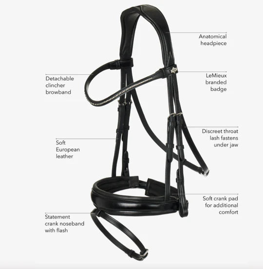 The LeMieux Bridles are made from beautifully soft European leather and feature an anatomically shaped headpiece with soft padded cut away around the ears and poll to aid in the distribution of pressure, maximising comfort.